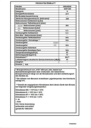 : Hohe Leistung bei niedrigem Energieverbrauch. Dieses Gerät bringt Leistung und Energieverbrauch clever unter einen Hut und ist mit der Energieeffizienzklasse A++ 25 % energieeffizienter als der Grenzwert zur Energieeffizienzklasse A+., Die Antibakterielle Türdichtung vermeidet Bakterienbildung., Leistung & Verbrauch: Energieeffizienzklasse: A++, Modellbezeichnung: GCF 284, Jährlicher Energieverbrauch: 208 kWh, Nutzinhalt Gefrierteil (netto): 284 l, Sternekennzeichnung: 4 Sterne, Frostfrei: Nein, Lagerzeit bei Störung: 67 Stunden, Gefriervermögen in 24 Stunden: 17 kg, Klimaklasse: SN-T, Betriebsgeräusch: 43 dB, Betriebskosten: Energiekosten/Jahr: 62,40 Euro, * Kalkuliert mit Energiekosten von 0,30 € für die kWh Strom. Die Basis ist der gewichtete Energieverbrauch pro Jahr lt. Energielabel. Ausstattung: Display: nein, Wasserspender: Nein, Festwasseranschluss nötig: Nein, Art des Warnsignals: Optisch, Türanschlag wechselbar: Nein, Transportrollen: Ja, Weitere Ausstattungen: Türschloss, Antibakterielle Türdichtung, Ausstattung Gefrierteil: Anzahl der Gefrierkörbe: 3, Informationen zum Einbau: Einbauart: freistehend, Technische Daten: Frontfarbe: weiß, Farbe Seitenteile: weiß, Höhe: 86 cm, Breite: 128,5 cm, Tiefe: 72,5 cm, Spannung: 230 Volt, Absicherung: 10 Ampere, Anschlusswert: 0,11 W